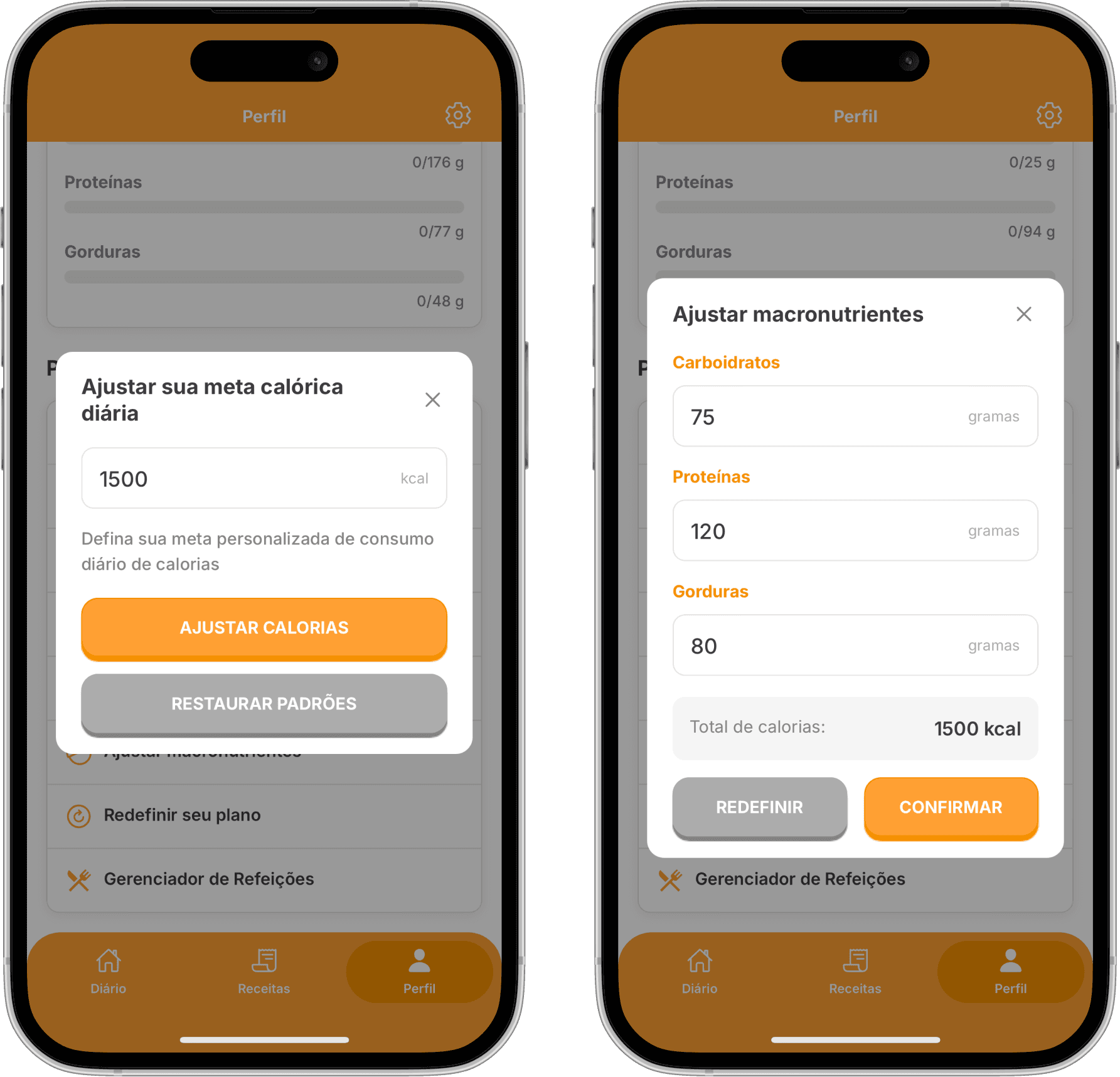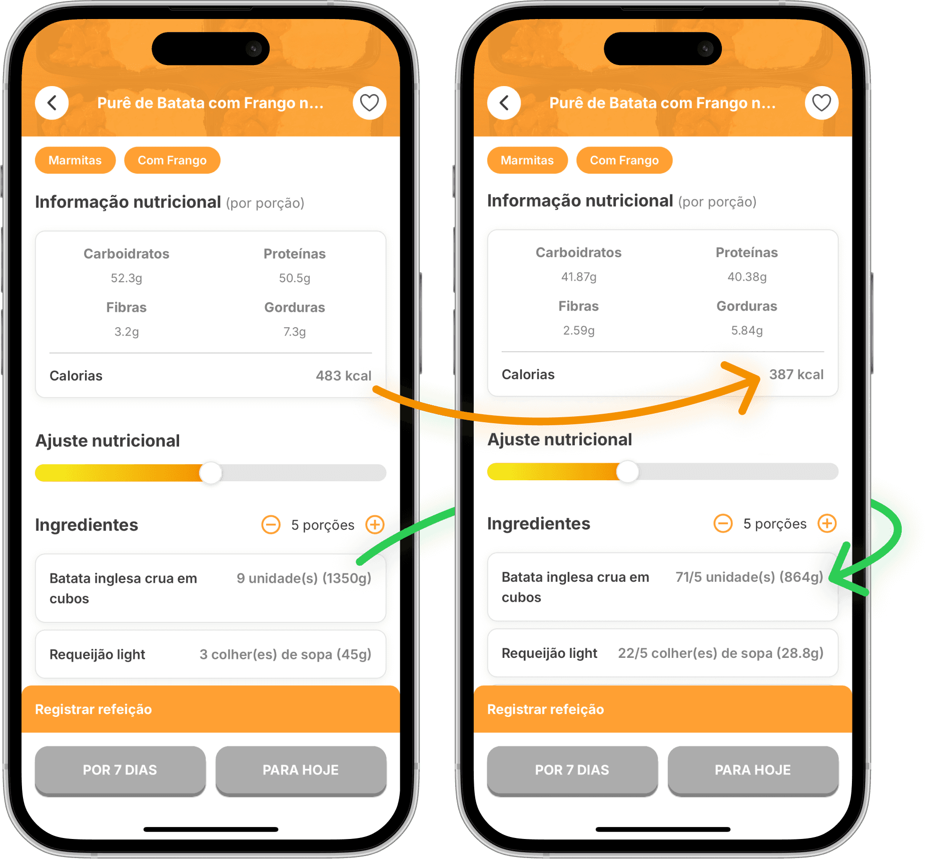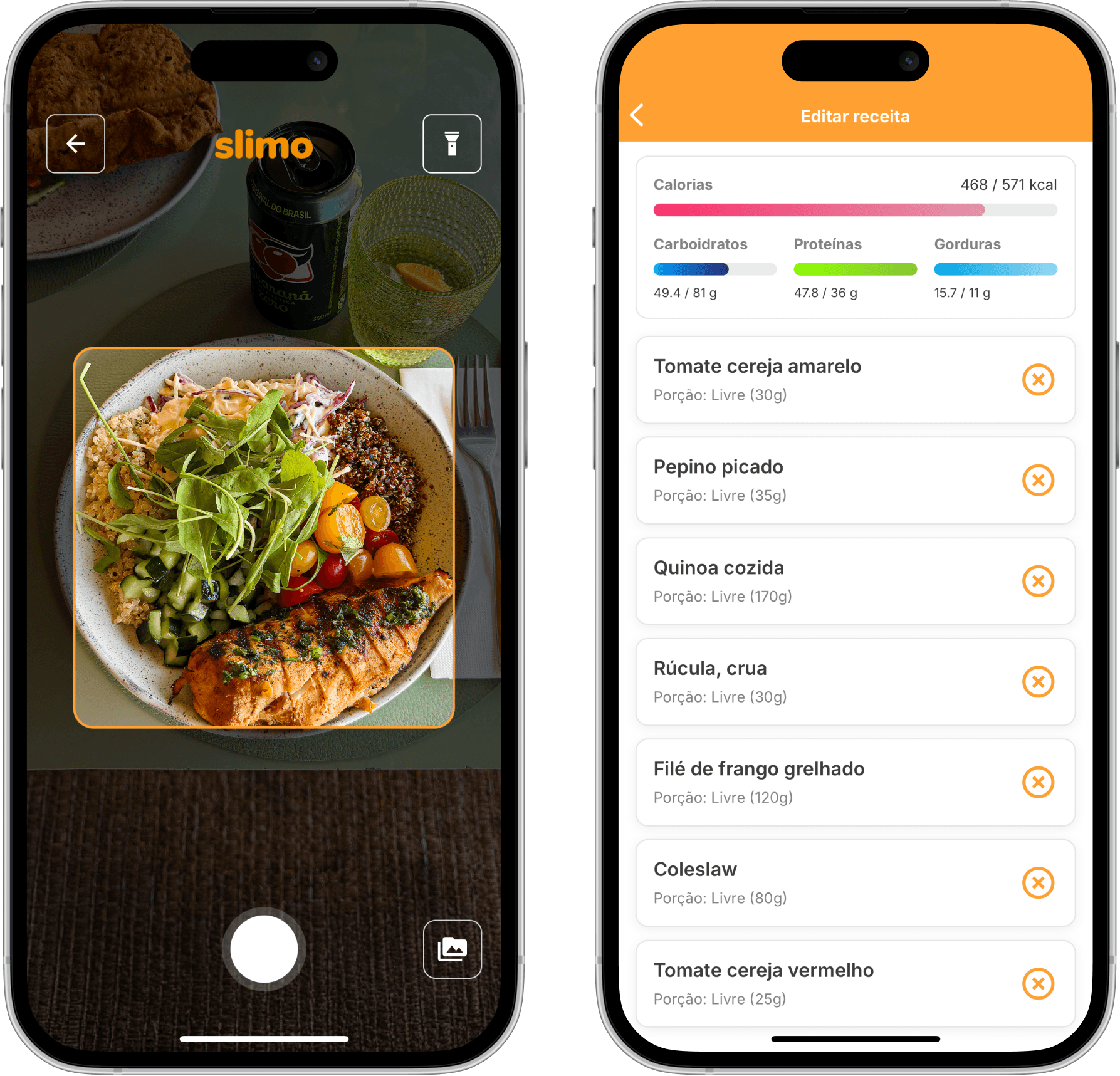 Use o slider pra aumentar ou reduzir calorias — o Slimo ajusta as quantidades dos ingredientes mantendo o equilíbrio nutricional.